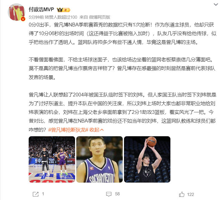 付政浩:0出手0分,东道主球员只有10分钟还是得益于进入加时赛,队友根本不给球,似乎把曾凡博当透明人,篮网队不懂人情世故这是曾凡博主场,完全不给蔡老板面子吗?难道真的把曾凡博当票房吉祥物了?