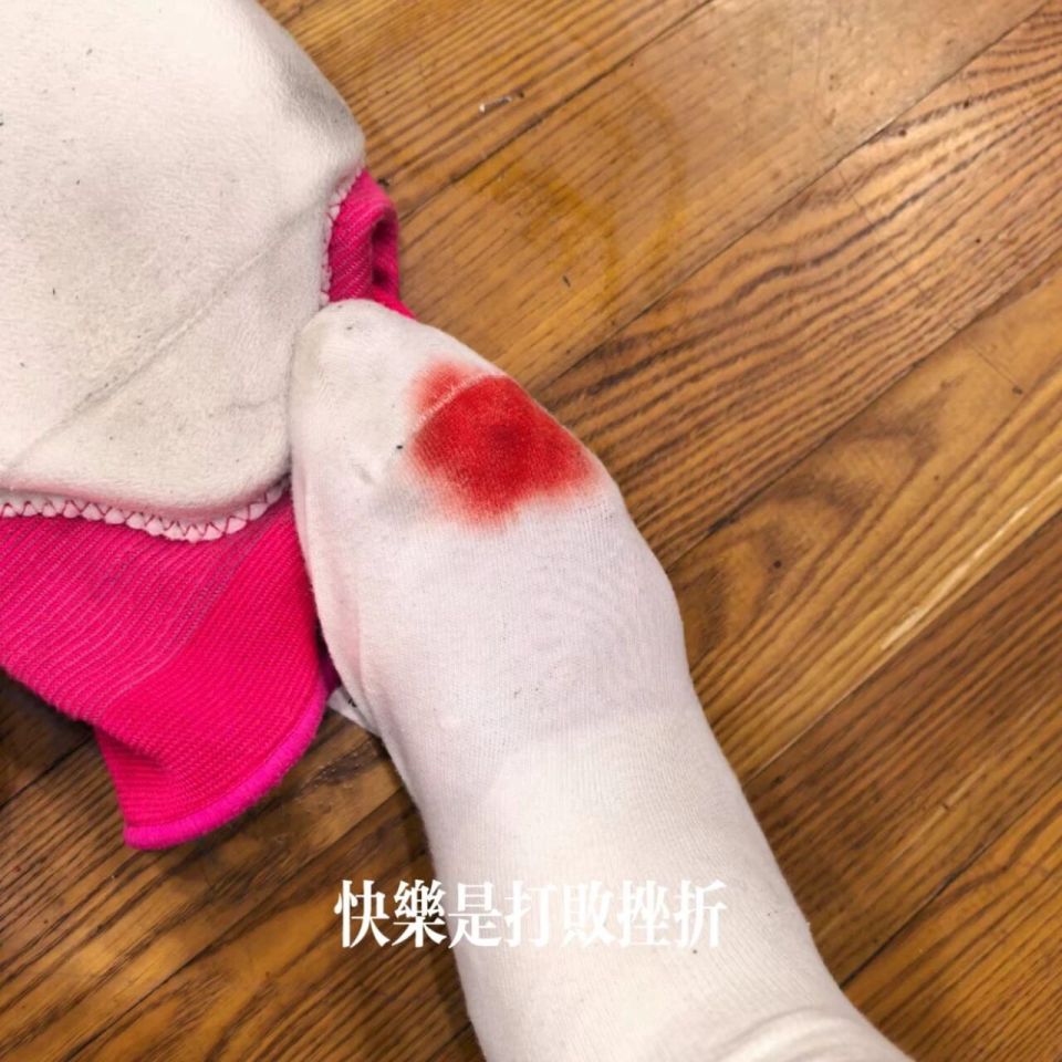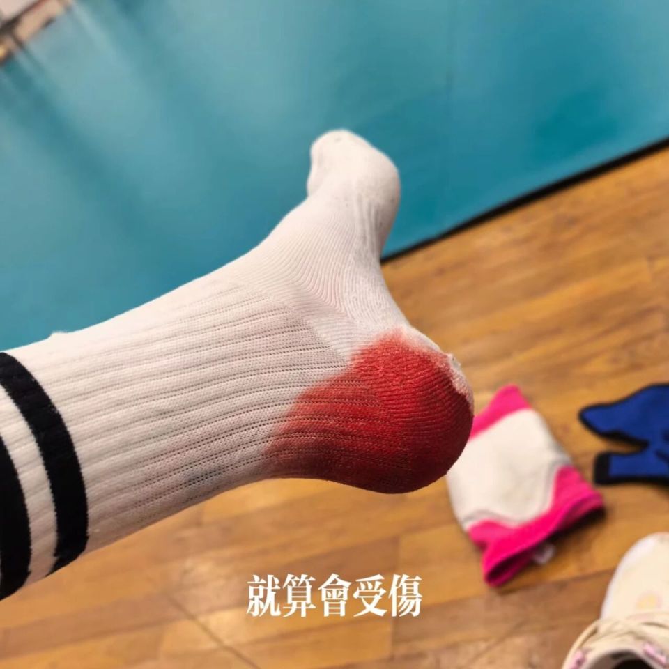 她的脚跟皮肤红肿破裂,几处伤口裸露在外,显得触目惊心,最后则聚焦在脚尖位置,同样是被血液染红的白袜,而旁边的粉色护具仿佛提醒着,这些“外表看不见的伤”,不过是训练日常的一部分。